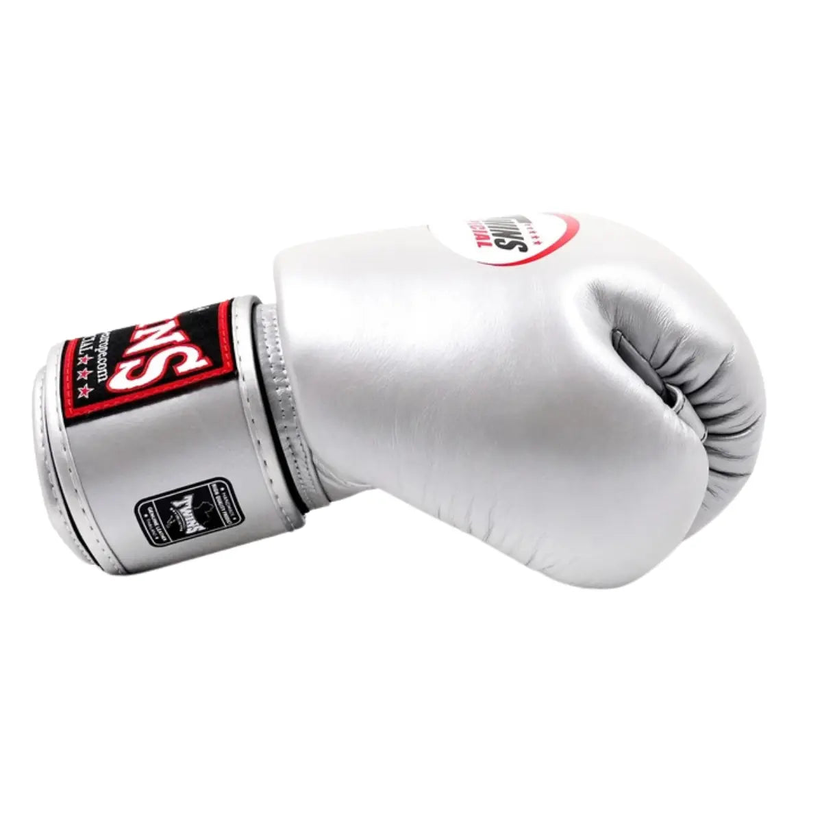 Twins Special BGVL3 bokshandschoenen in zilver leer met stevige polsondersteuning en duurzame foamvulling voor intensieve kickbokstraining