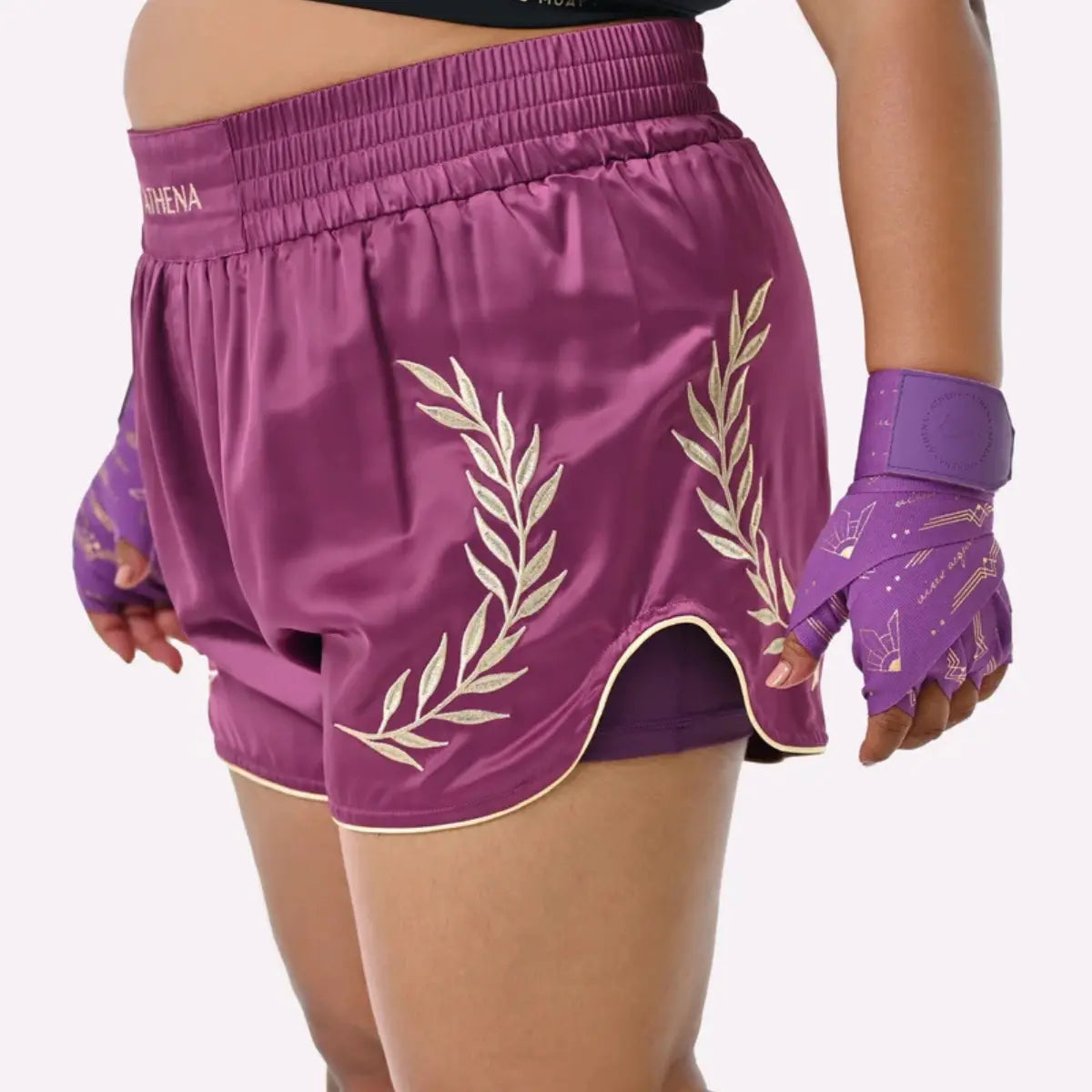 Vrouw draagt het Athena Fightwear Thaiboks Broekje in plum met gouden lauwerdetails tijdens een training.