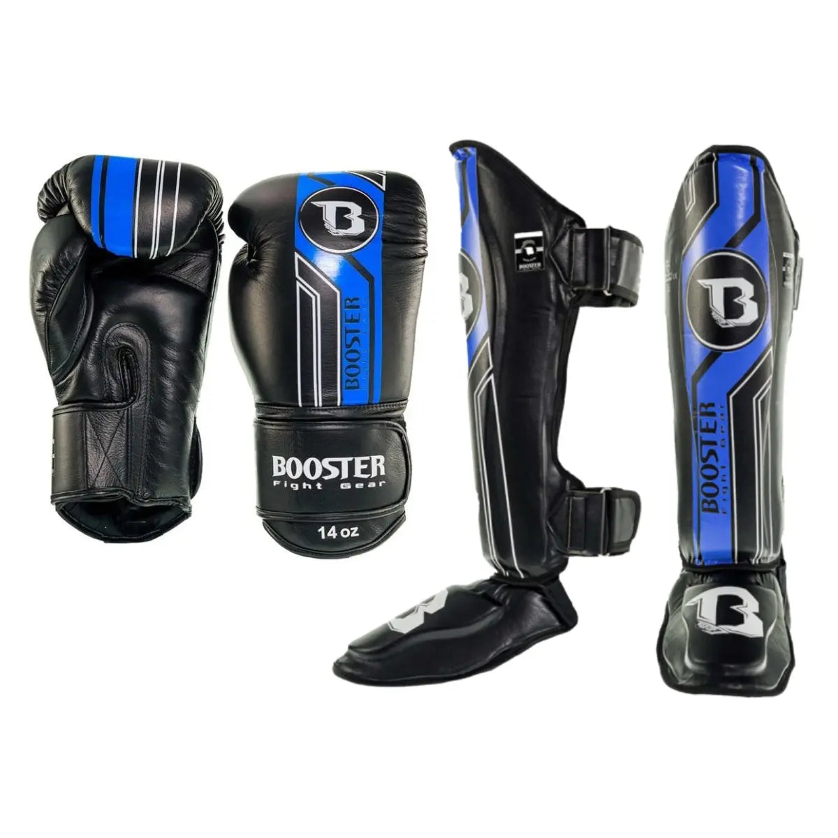 Complete Booster BGL V9 kickboksset in de kleur zwart met elektrische blauwe accenten. De set bestaat uit een paar bokshandschoenen (14oz) en bijpassende scheenbeschermers