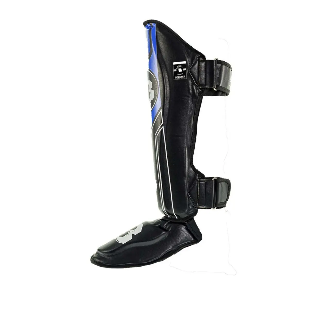 Zijaanzicht van een Booster BGL V9 scheenbeschermer in de kleur zwart-blauw met klittenbandsluitingen. De beschermer toont de volledige been- en voetbescherming.
