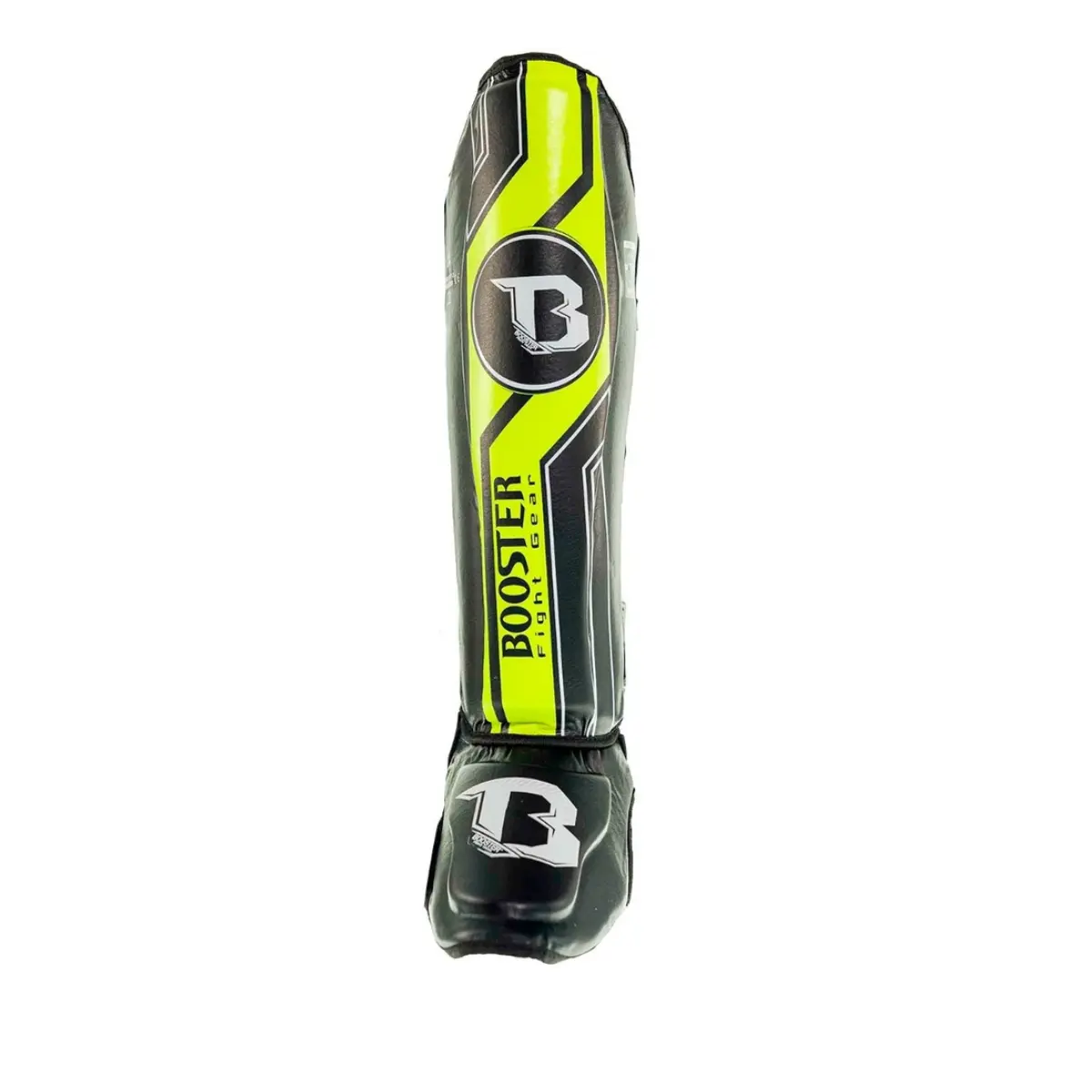 Booster scheenbeschermers BSG V9 zwart met felgele strepen en groot Booster-logo op scheen en wreef.