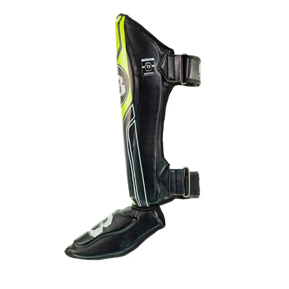 Booster scheenbeschermers BSG V9 zwart met felgele details, verstelbare klittenbandsluitingen en groot Booster-logo op scheen en wreef.