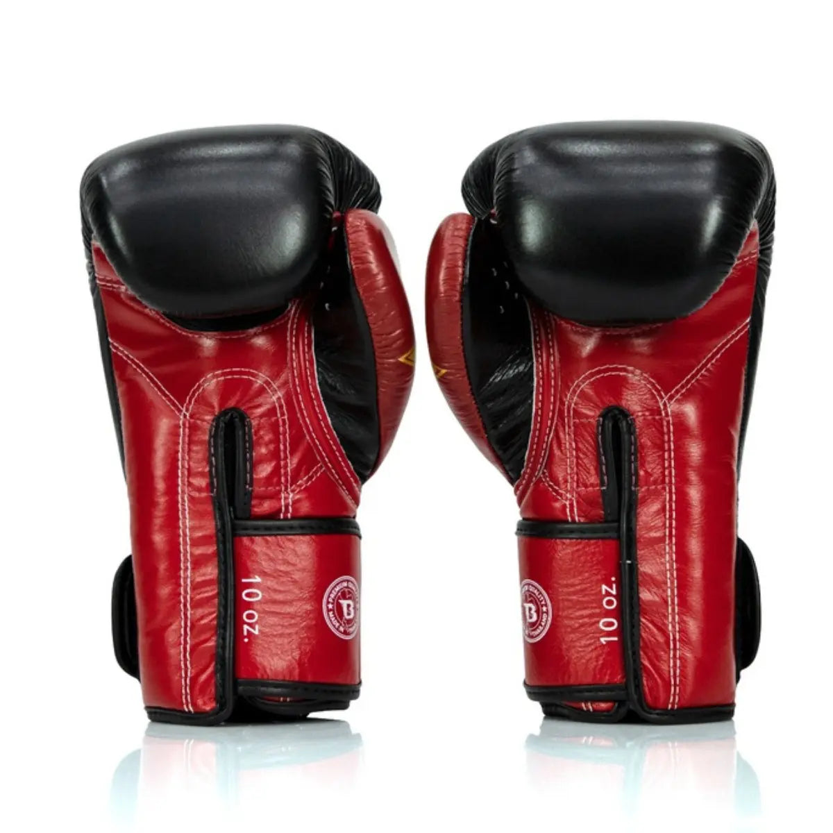 Achteraanzicht van rood-zwarte Fairtex x Booster bokshandschoenen met witte stiksels en gewichtsaanduiding van 10 oz.