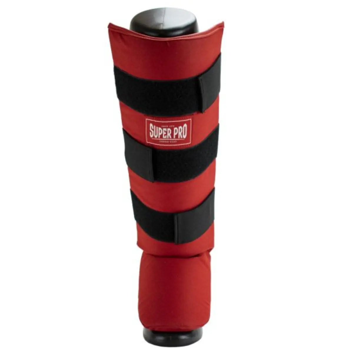 Rode Super Pro scheenbeschermer met zwarte klittenbandsluitingen en wit logo, ontworpen voor optimale bescherming tijdens kickbokstraining.
