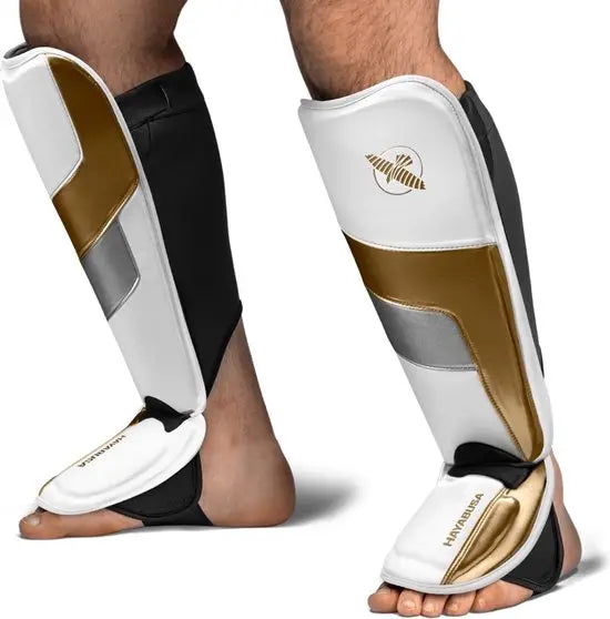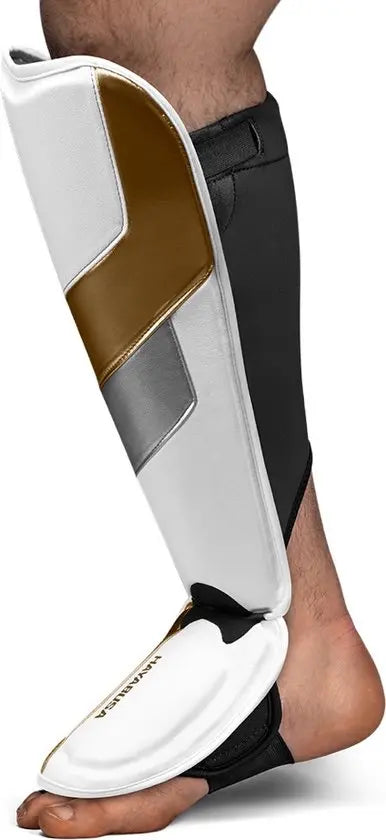 Hayabusa Scheenbeschermers T3 Full Back Wit/Goud: Krachtige bescherming, stijlvol design