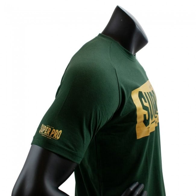 Donkergroen Super Pro T-shirt met opvallend goudkleurig bloklogo “Super Pro Combat Gear” op de borst. Het shirt heeft korte mouwen, een ronde hals en een sportieve pasvorm, ideaal voor training of casual streetwear.