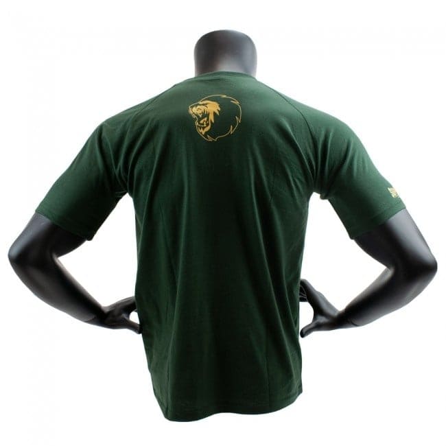 Achterkant van het Super Pro T-shirt Block Logo Groen, met een subtiel goudkleurig leeuw-logo in de nek. Het shirt is donkergroen, heeft korte mouwen en een comfortabele sportieve pasvorm, perfect voor training of casual gebruik.