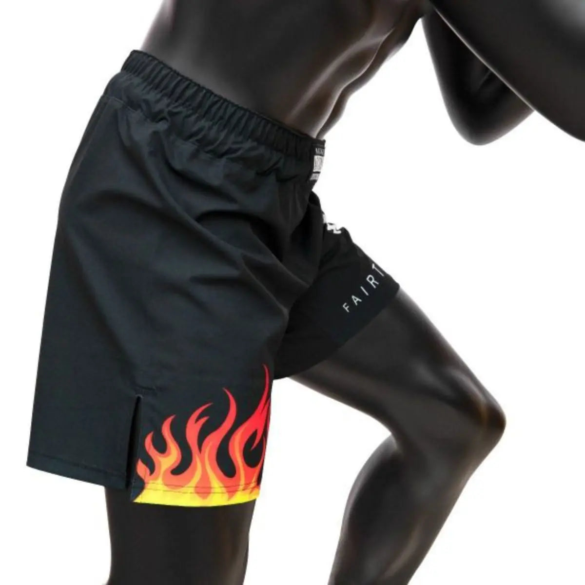 Zijaanzicht van de Fairtex Kickboks Short Flames Zwart, met een vurige vlammenprint in rood en geel. De lichte satijn polyester stof en split aan de zijkant bieden maximale bewegingsvrijheid voor explosieve kicks.
