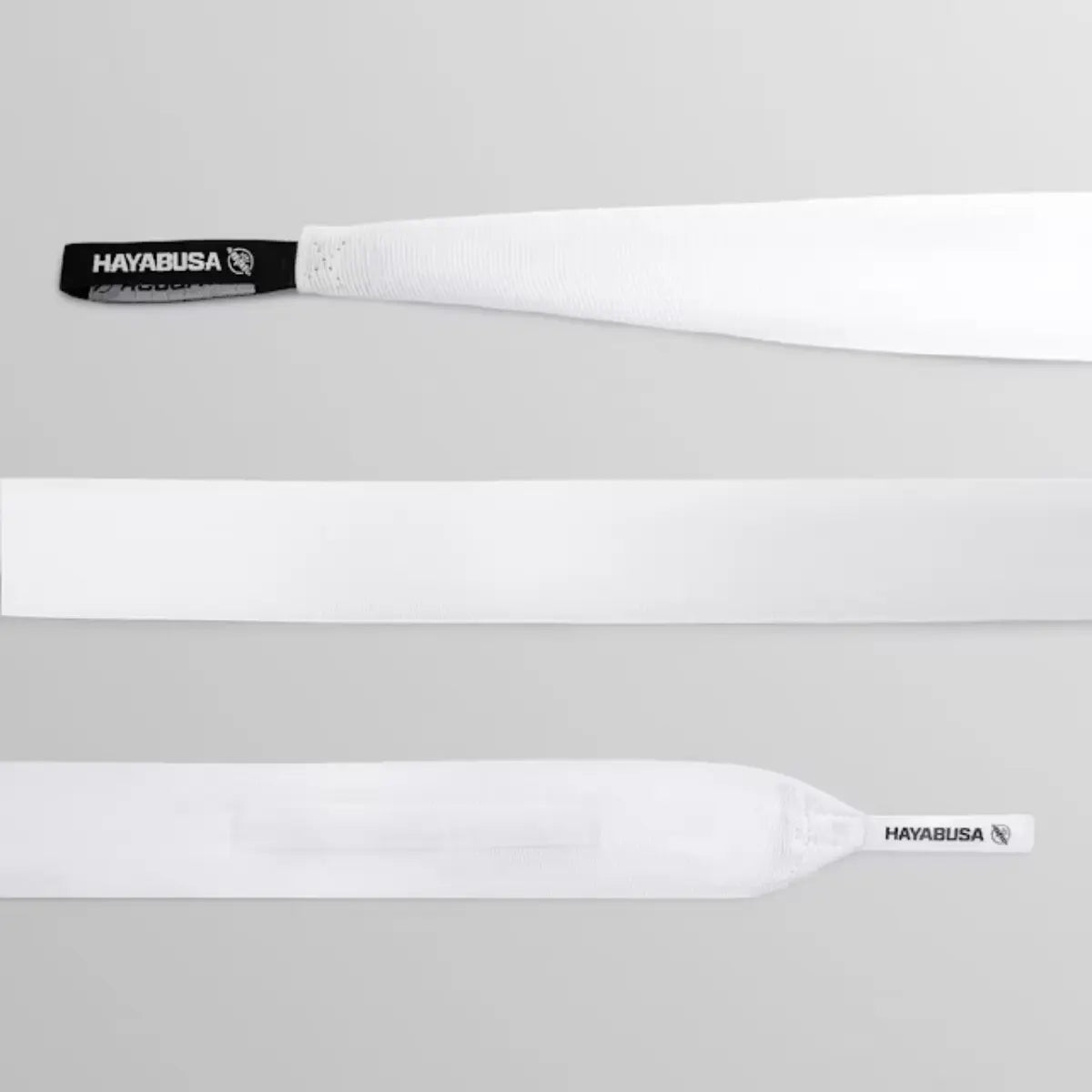 Paar opgerolde witte Hayabusa handwraps, waarvan één band opgerold is en de andere uitgerold, met de zwarte logo's.