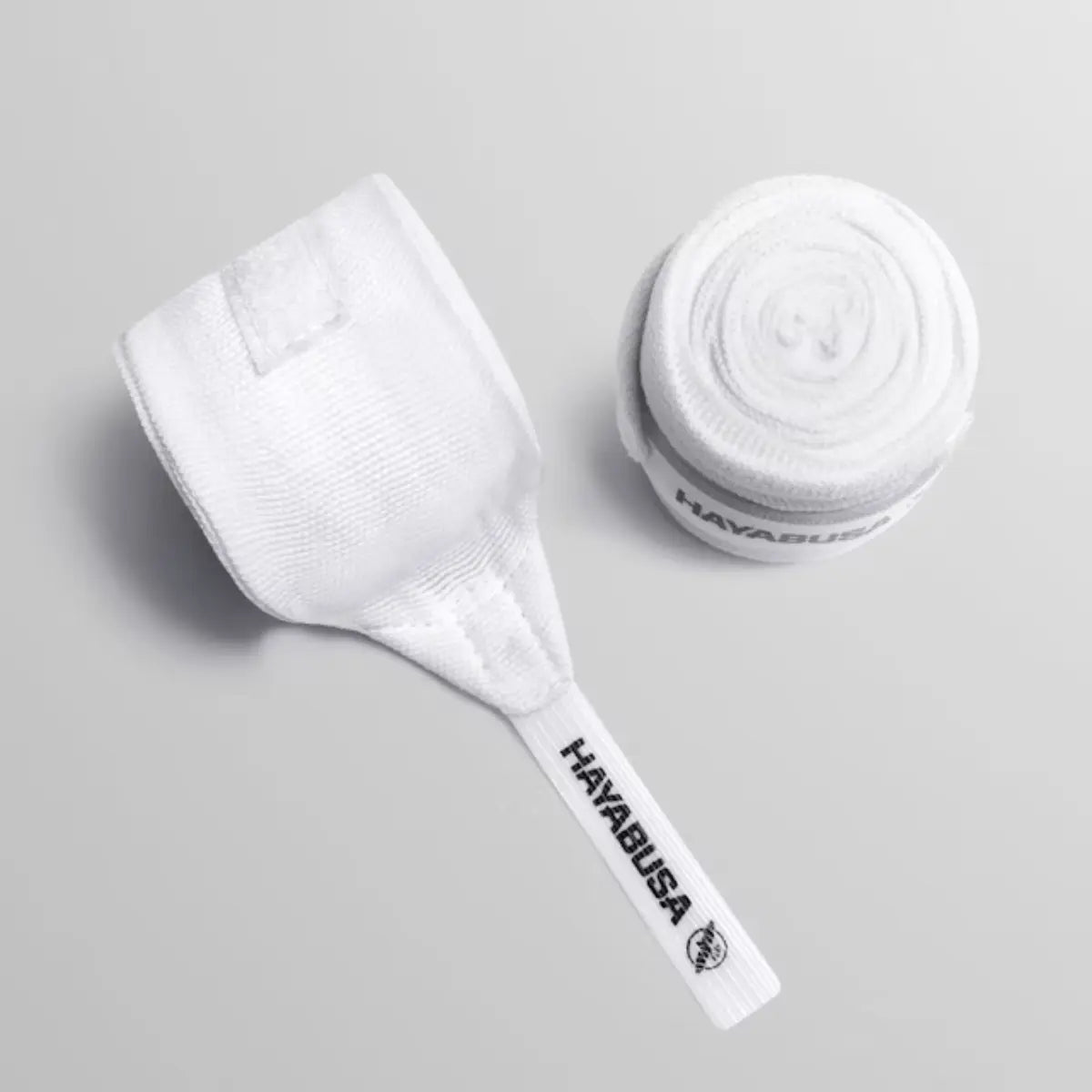 Productdetail van witte Hayabusa handwraps, met een opgerolde band, een plat stuk stof, en het logo op de lus voor de duim.