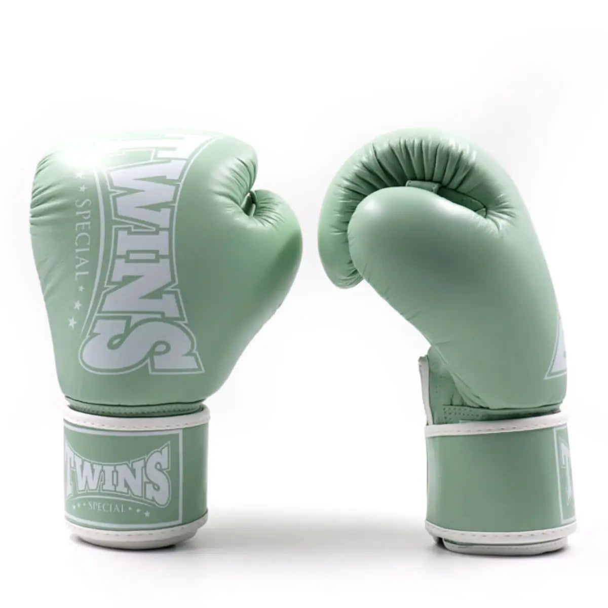 Een paar Twins bokshandschoenen in een stijlvolle mintgroene kleur, gemaakt van hoogwaardig leer met een stevige klittenbandsluiting. De handschoenen tonen het klassieke Twins-logo op de pols en zijn ontworpen voor intensieve bokstrainingen en sparring.