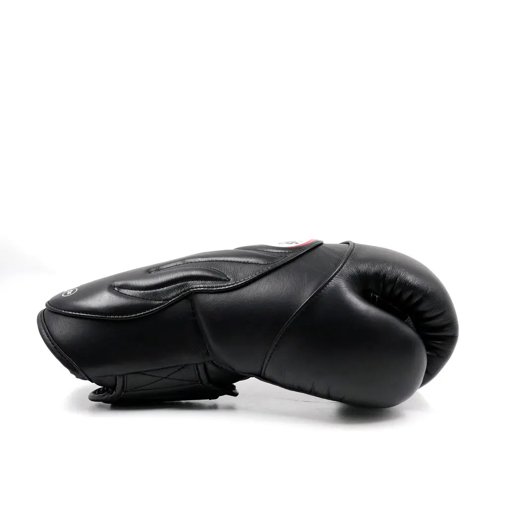 Zwarte Twins bokshandschoen van leer, liggend op een witte achtergrond met subtiele stiksels en beschermende padding zichtbaar.