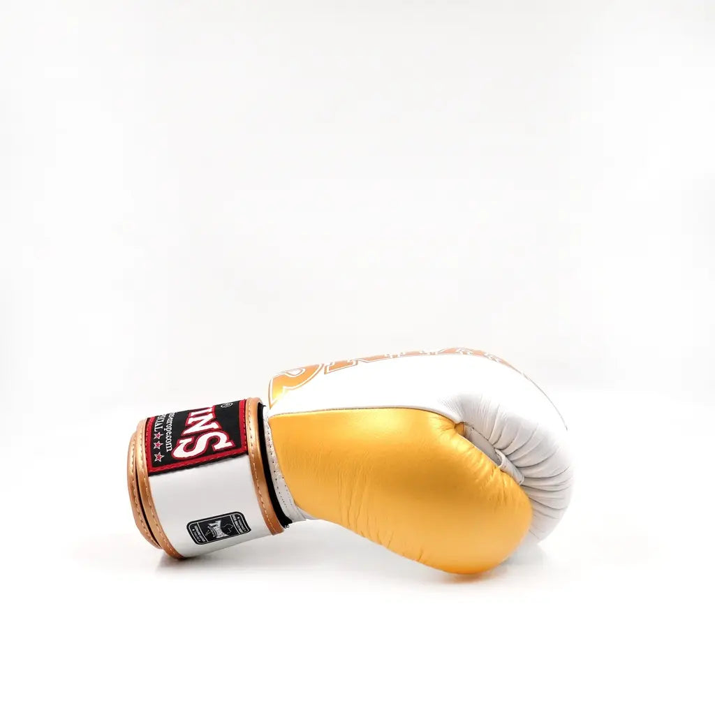 Set Twins bokshandschoenen in wit en goud, rechtopstaand op een witte achtergrond met groot TWINS-logo op de vuistzijde en rood label op de polsband.