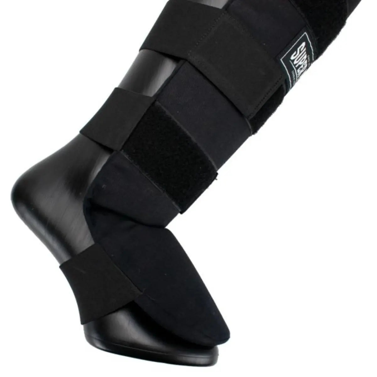 Close-up van het Super Pro logo op de zwarte Savior scheenbeschermer.