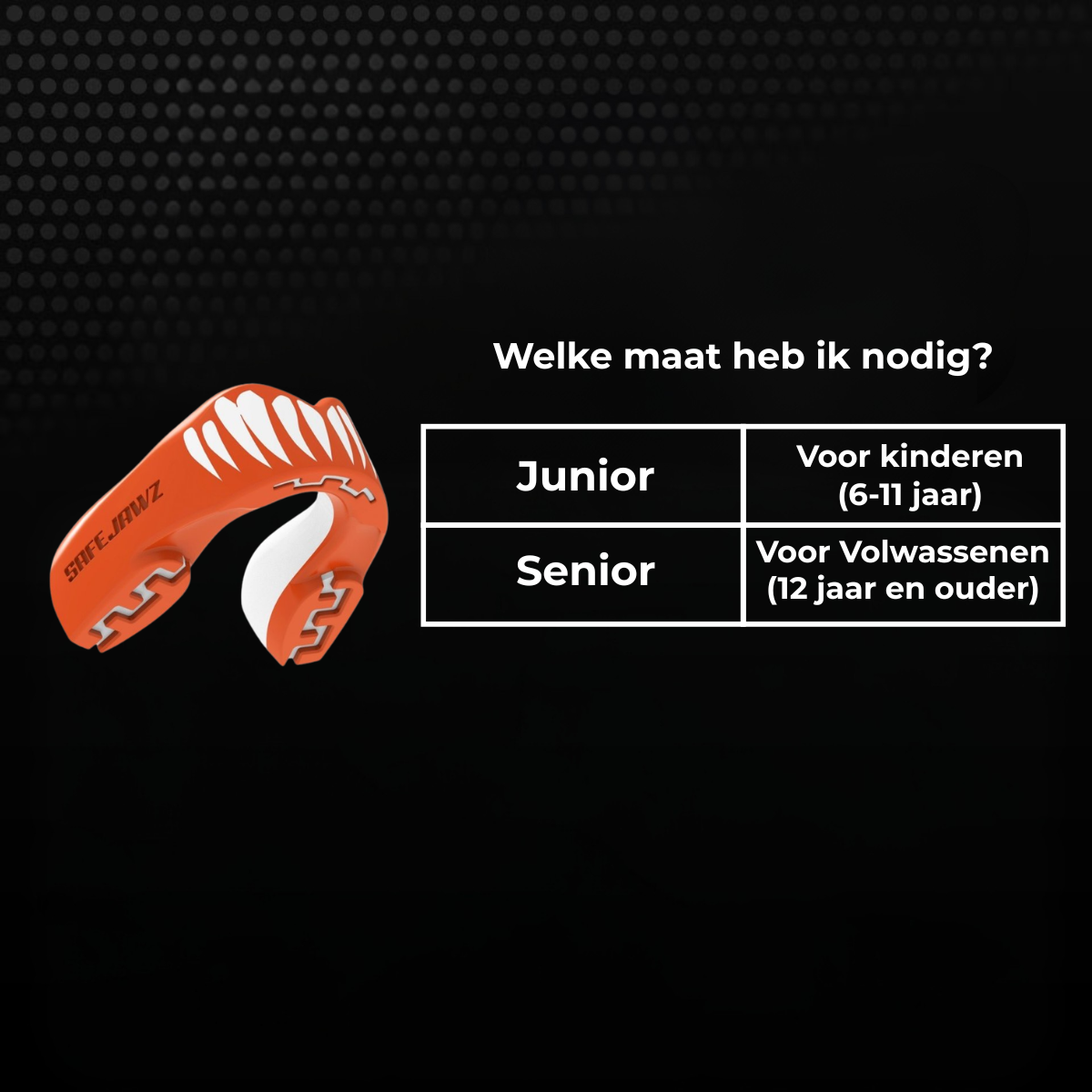 The SafeJawz Extro Series Viper is available in two sizes: Junior for children up to 11 years old and Senior for everyone from 12 years old. These variants ensure that martial artists of all ages can get the right protection. We also guarantee that the mouthguard is suitable for both women and men!