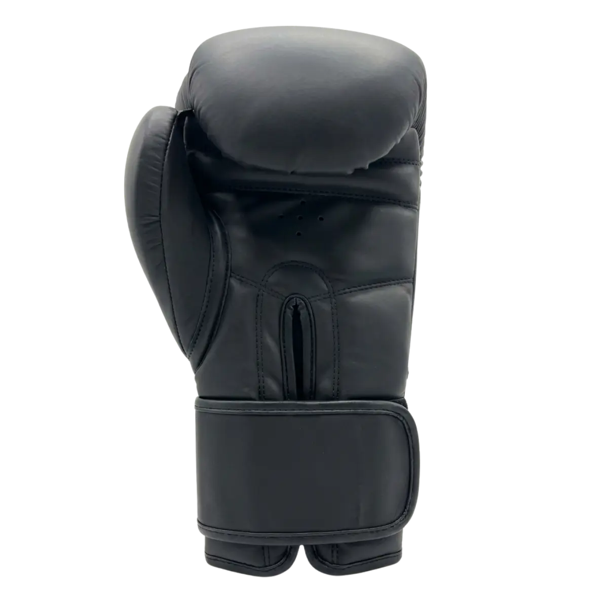 Close-up van zwarte Martial Arts Center bokshandschoen met lange klittenbandsluiting en zichtbare stiknaden aan de palmzijde.